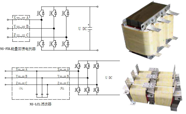 能量回馈电抗器安装在PWM变频器的输入端,也可作为输入电抗器使用。并且能与滤波电容器组成LC滤波器,以及能与输入电抗器及滤波电容器组成LCL滤波器,变频器能量回馈时降低开关频率纹波电流所衍生的高次谐波电流,并将谐波电流控制在一定的范围内,消除谐波电流对电网及变频器的影响,净化电网质量。