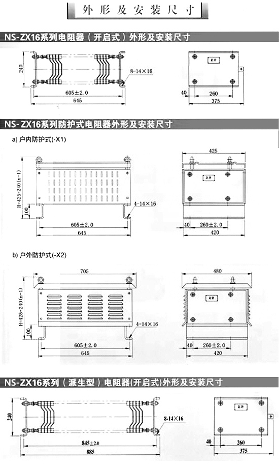 NS-ZX16 系列不锈钢电阻器是本公司最新研制推广的电阻器换代产品,具有容量大、耐腐蚀、无感应、工艺先进、阻值精度高、生产周期短等优点。可完全替代 ZX1 系列铸铁电阻器、 ZX2 系列康铜电阻器及 ZX9 系列、 ZX12 系列和 ZX10 (原 ZX15 )系列铁铬电阻器。 NS-ZX16 系列不锈钢电阻器每台由 20 片不锈钢电阻元件组装而成,电阻元件之间的联接采用了本公司独特的 “ 电极自熔焊 ” 工艺,从而有效地保证了产品的安全性和可靠性。
